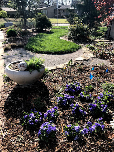 Our recent spring weather has been very cool and I had some concern about the emergence of many of the plants in the native plant garden in the hell strip. This was also the first spring in a while that we left the cut down of the previous years foliage around the trimmed plants and added 3-4" of arborist mulch on top of that. But alas all the plants burst out sooner of later. There were some newly fall planted grasses that we were careful in not covering up completely. The images below show the various depths of mulch. So enjoy your mulch madness too!